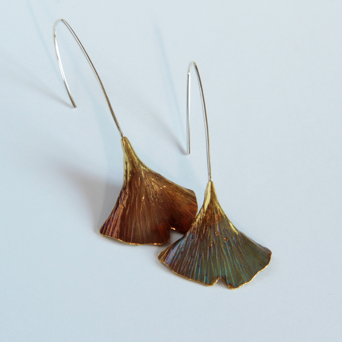 A ginkgolevél a hosszú élet szimbóluma. Ez a csinos kis fülbevaló minden alkalomra ideális viselet. Anyaga: a levél sárgaréz, a fülbevaló szára ezüst. A webshopban található vörösréz levéllel készült és teljes egészében ezüst verzió is. Mérete: 45 mm a teljes hossz, a levél szélessége 20-25 mm.