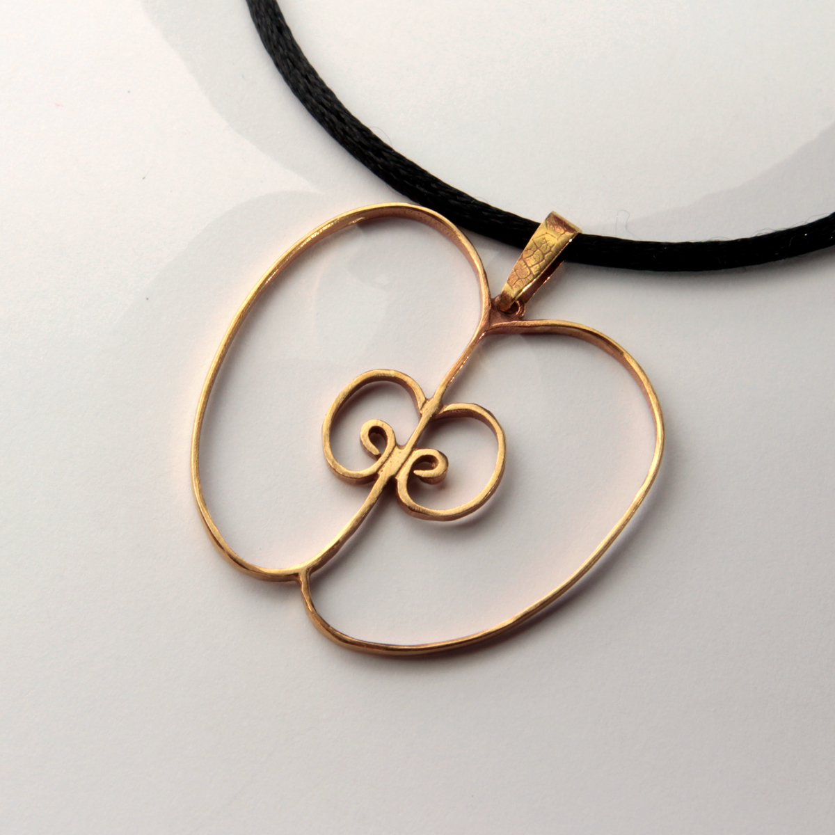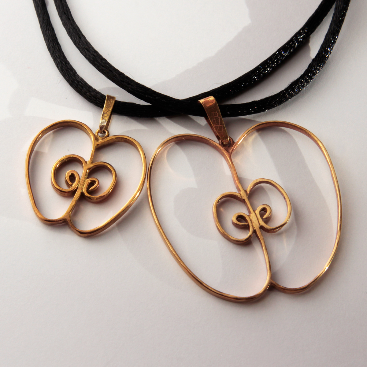 Almaszeletet ábrázoló vidám és különleges medál rézből. Anyaga: sárgaréz. Az alma mérete: 35x35 mm. Fekete selyem nyaklánc hossza: 45 cm Ezüstből is megvásárolható a webshopban.