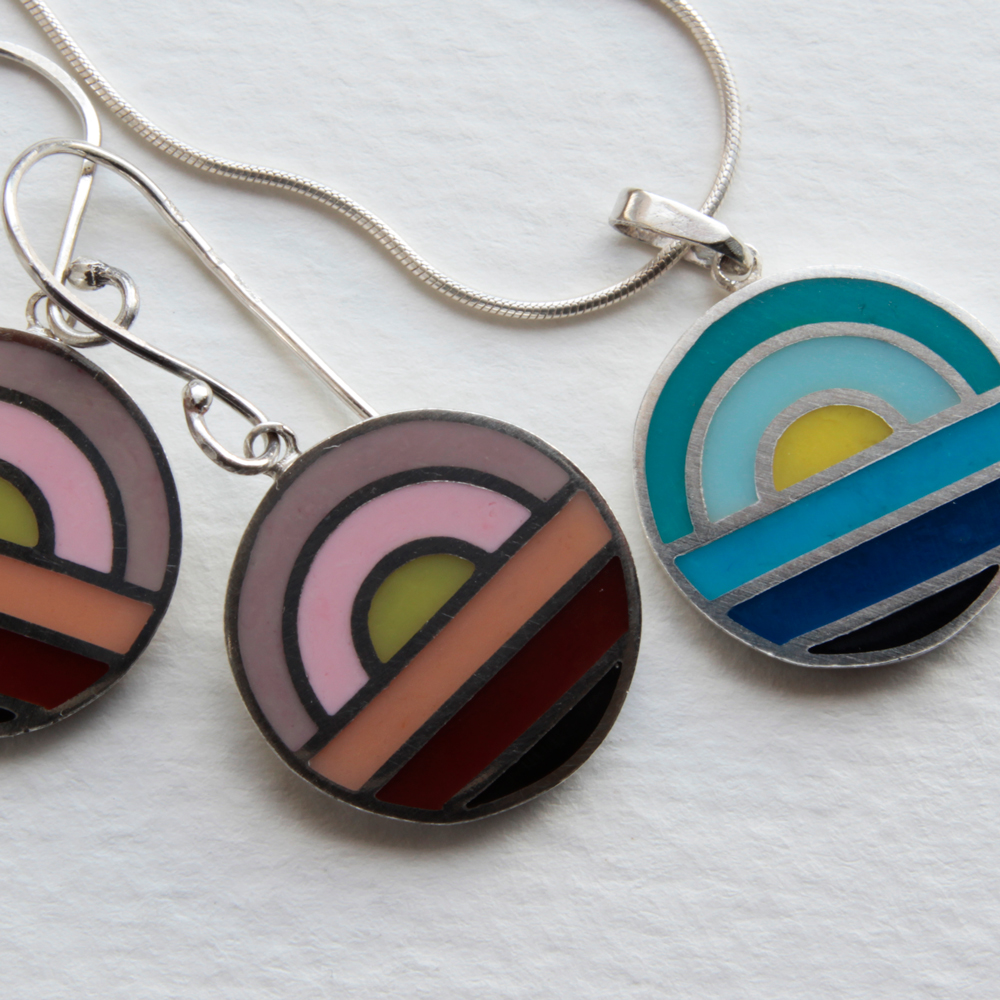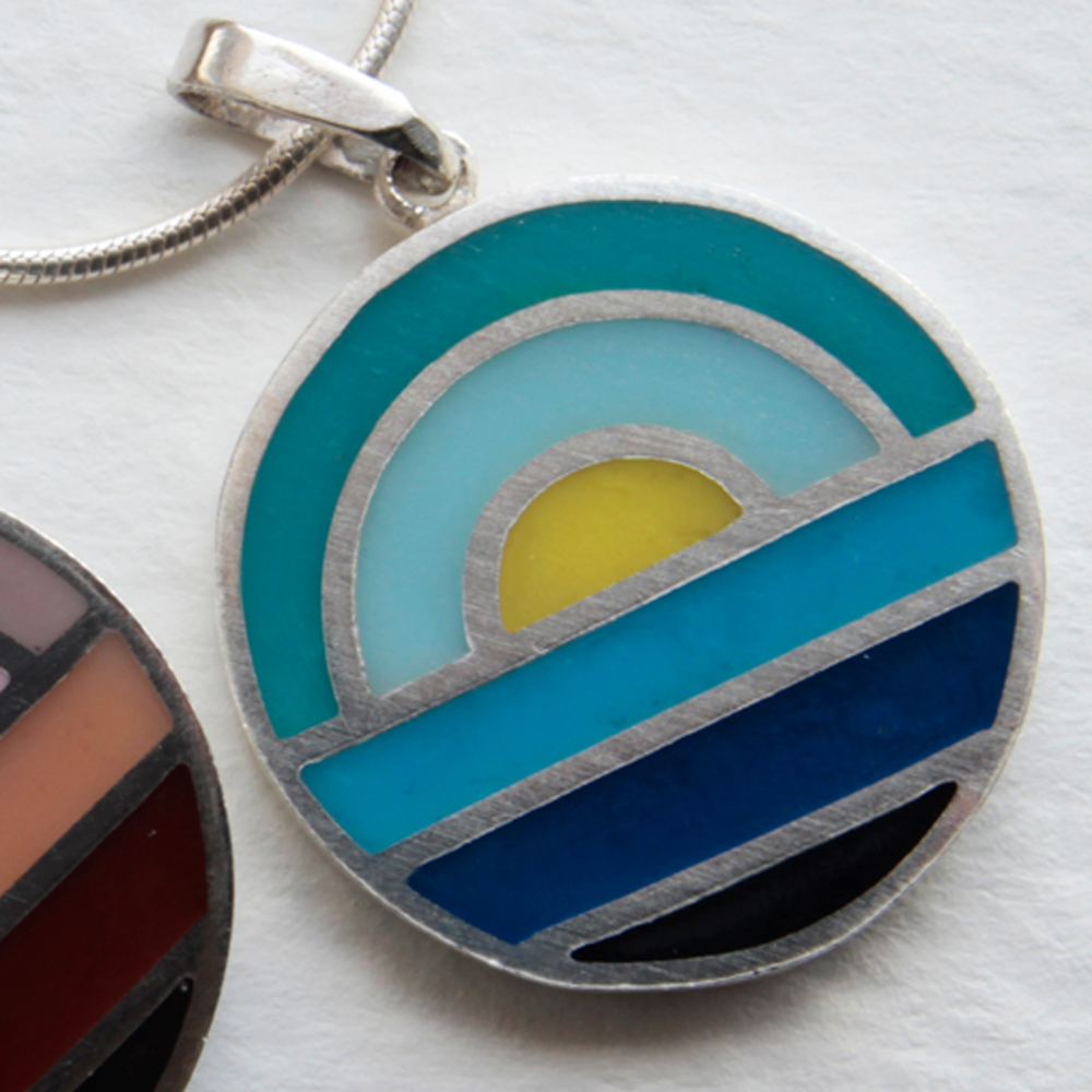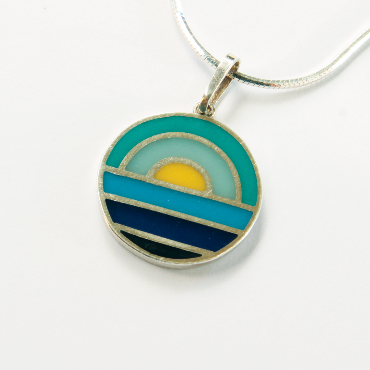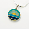 A veszprémi Retro Balaton kiállításon részt vett alkotás.Sárga, türkiz és a kék árnyalataival készítettem ezt a naplementét ábrázoló vidám medált. Anyaga: ezüst. Átmérő: 16 mm, a lánc hossza: 45 cm.