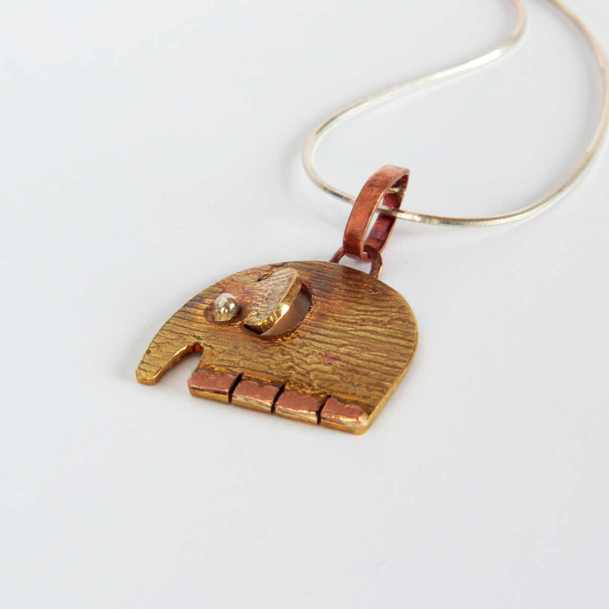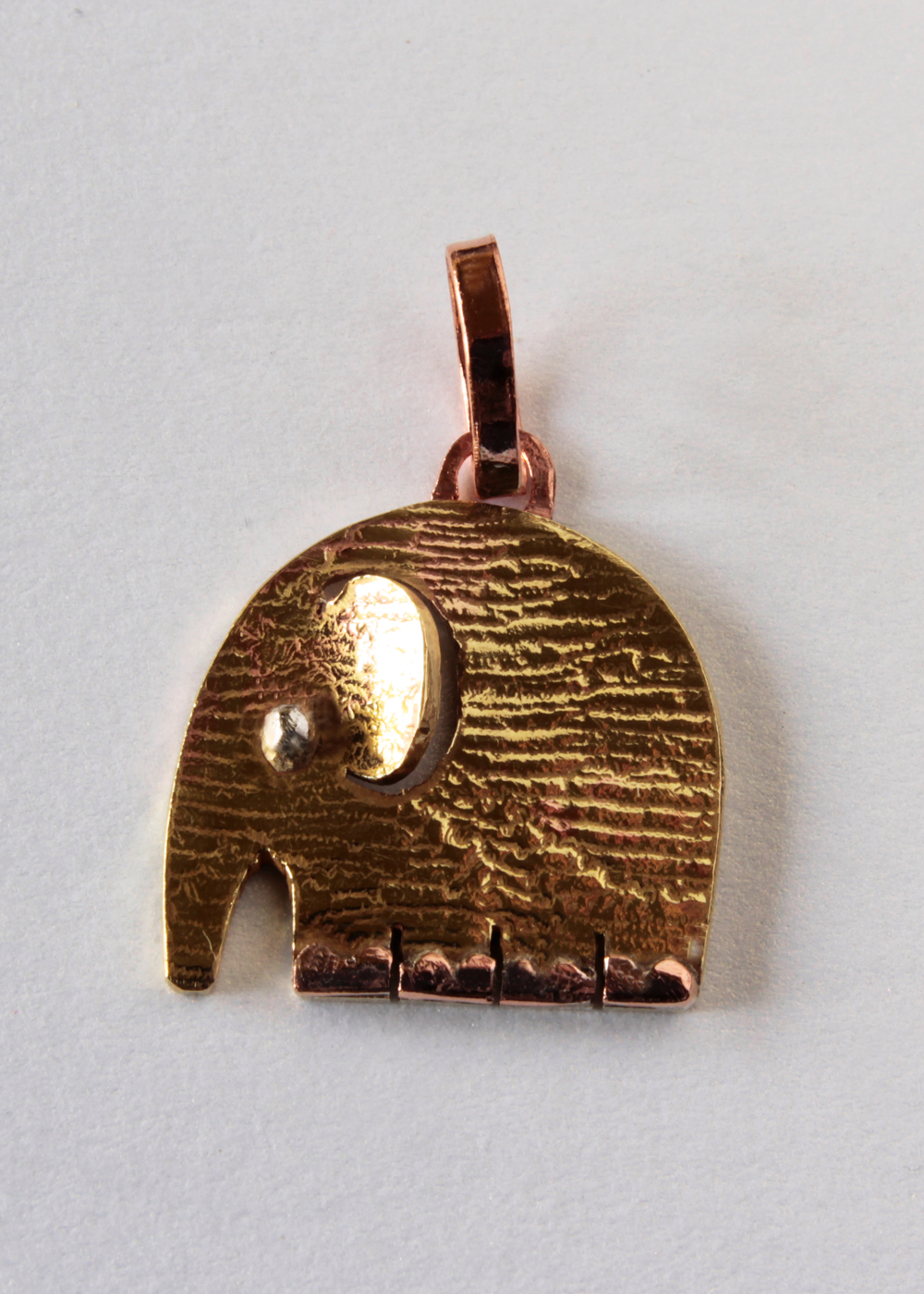 Ezüst szemű, vörösréz körmökkel ellátott, nyakban hordható sárgaréz elefánt.