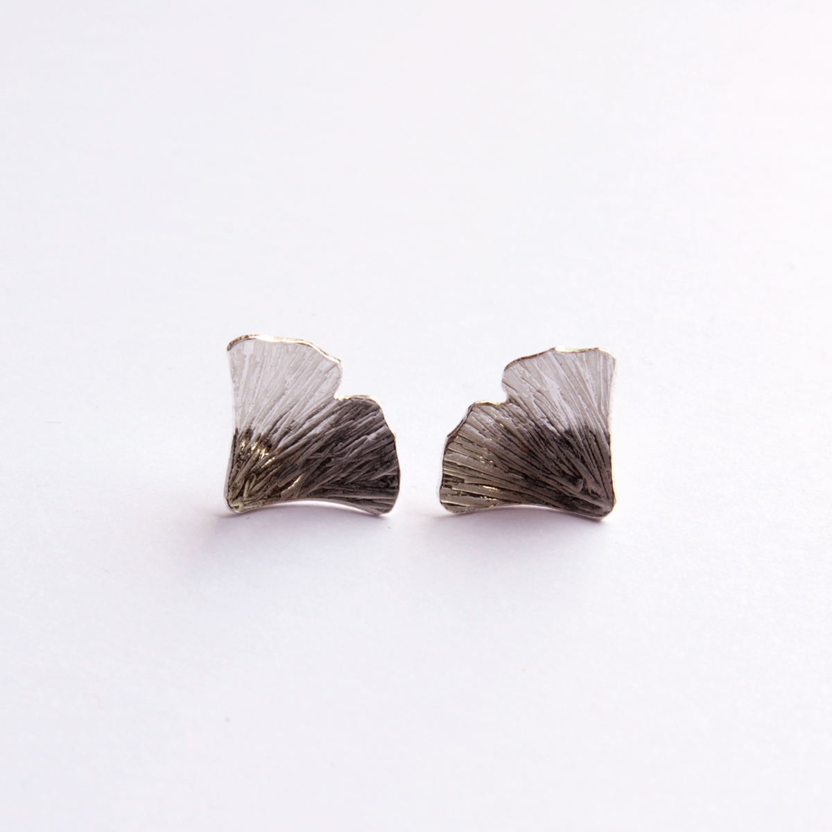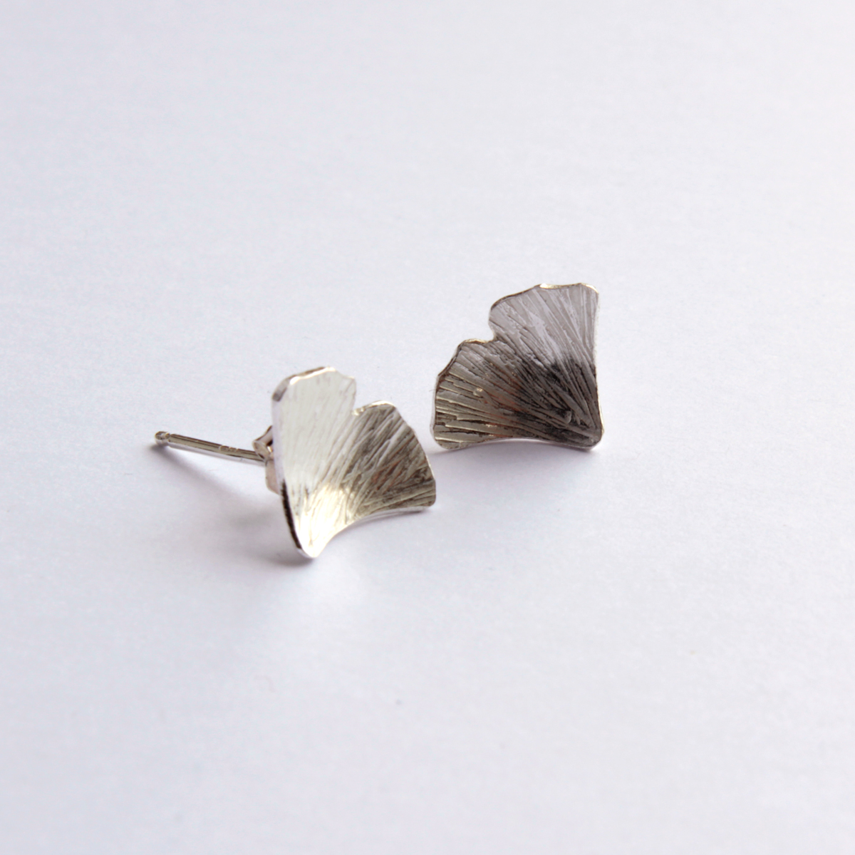 Két szép ginkgolevelet formázó bedugós ezüst fülbevaló.Teljes egészében kézzel készült ékszer.Méret: 8-10 mm