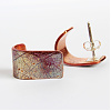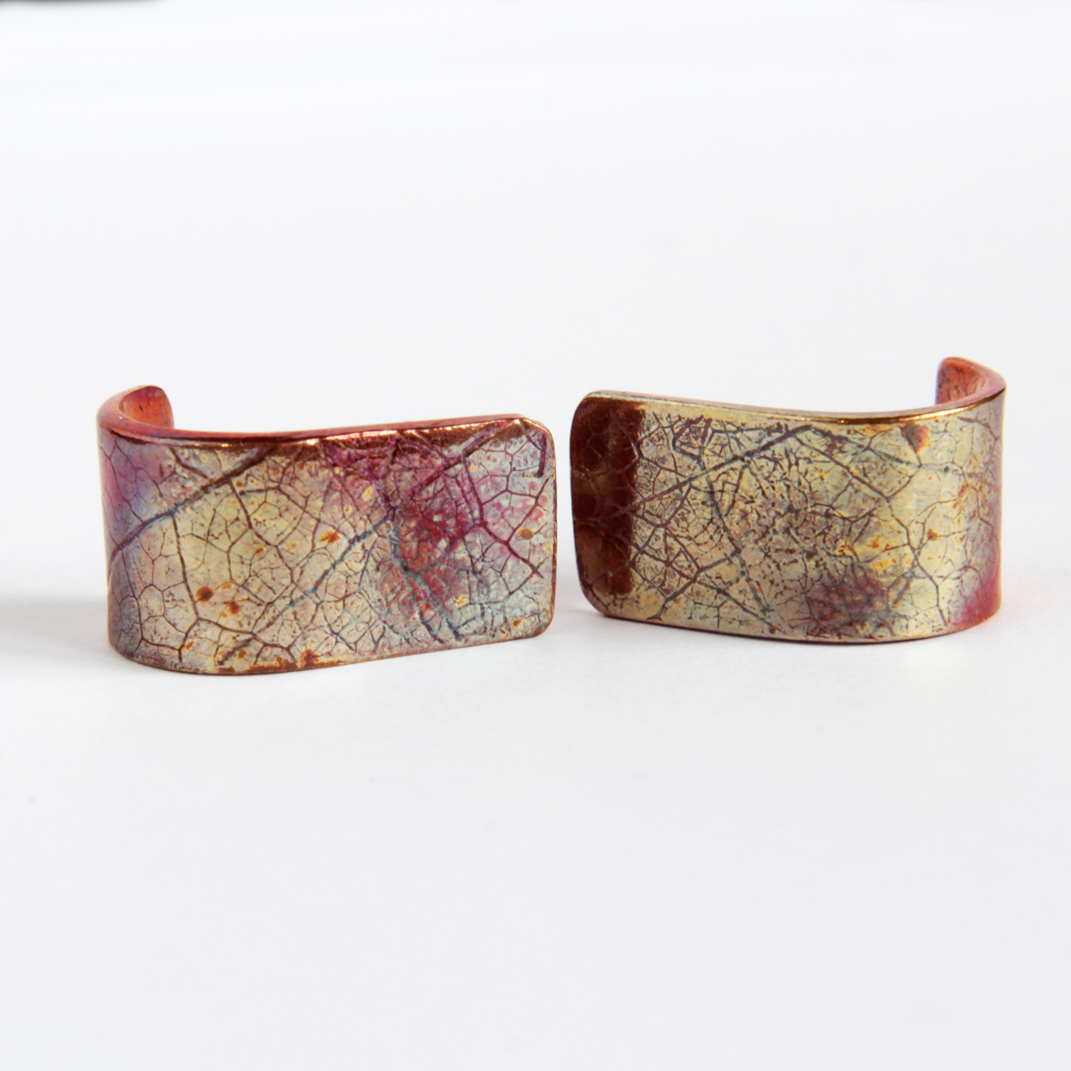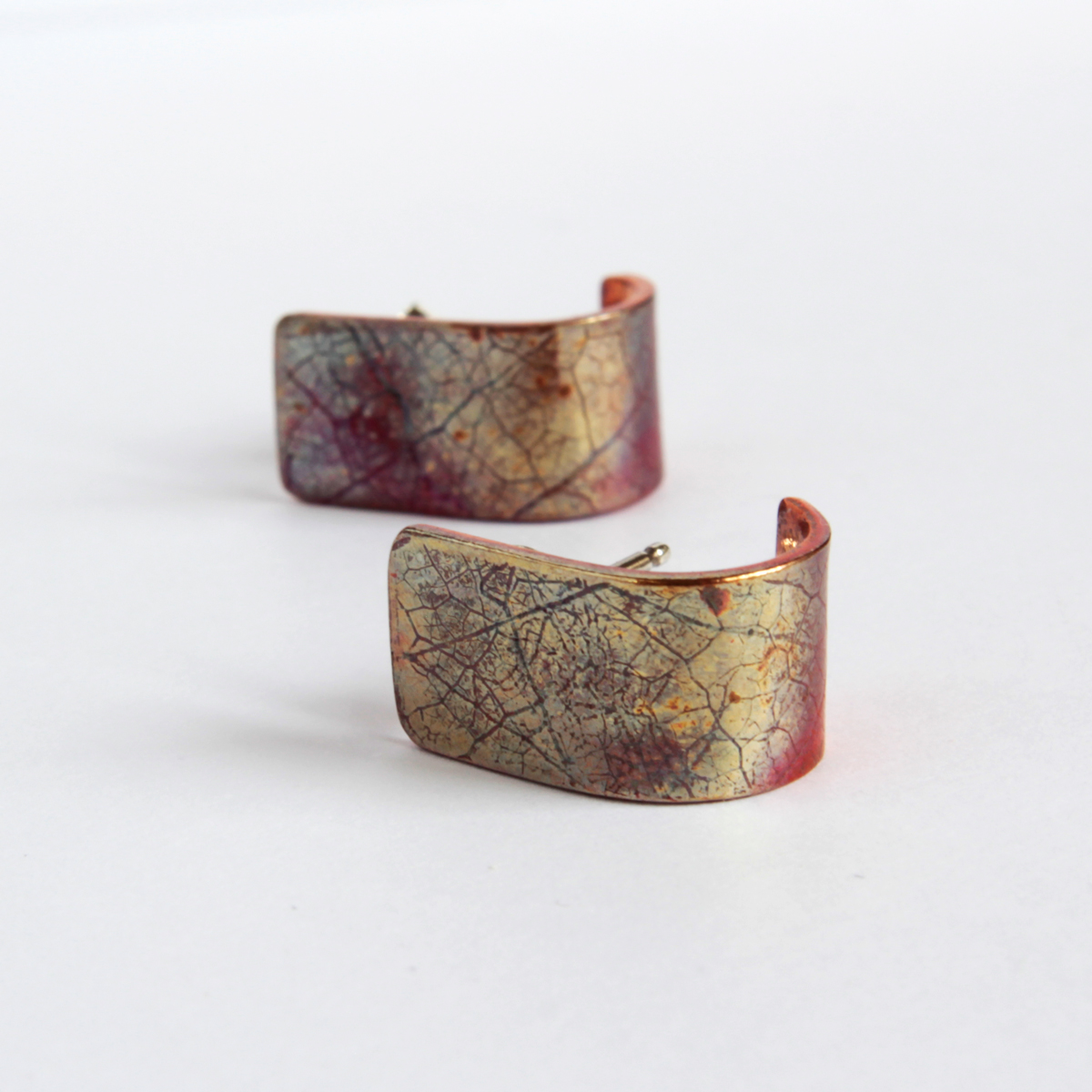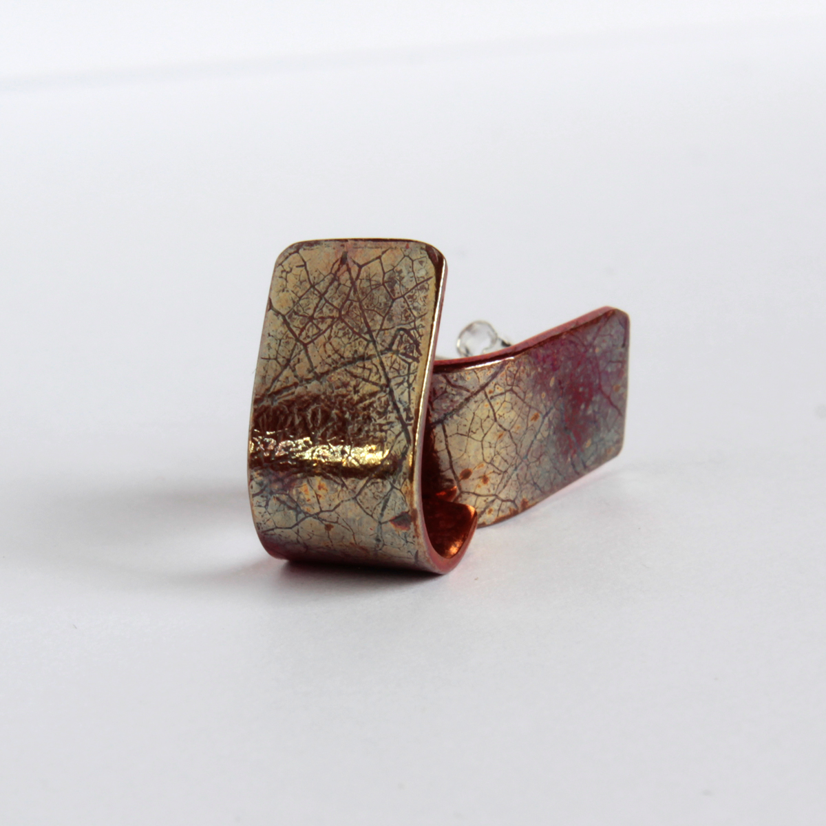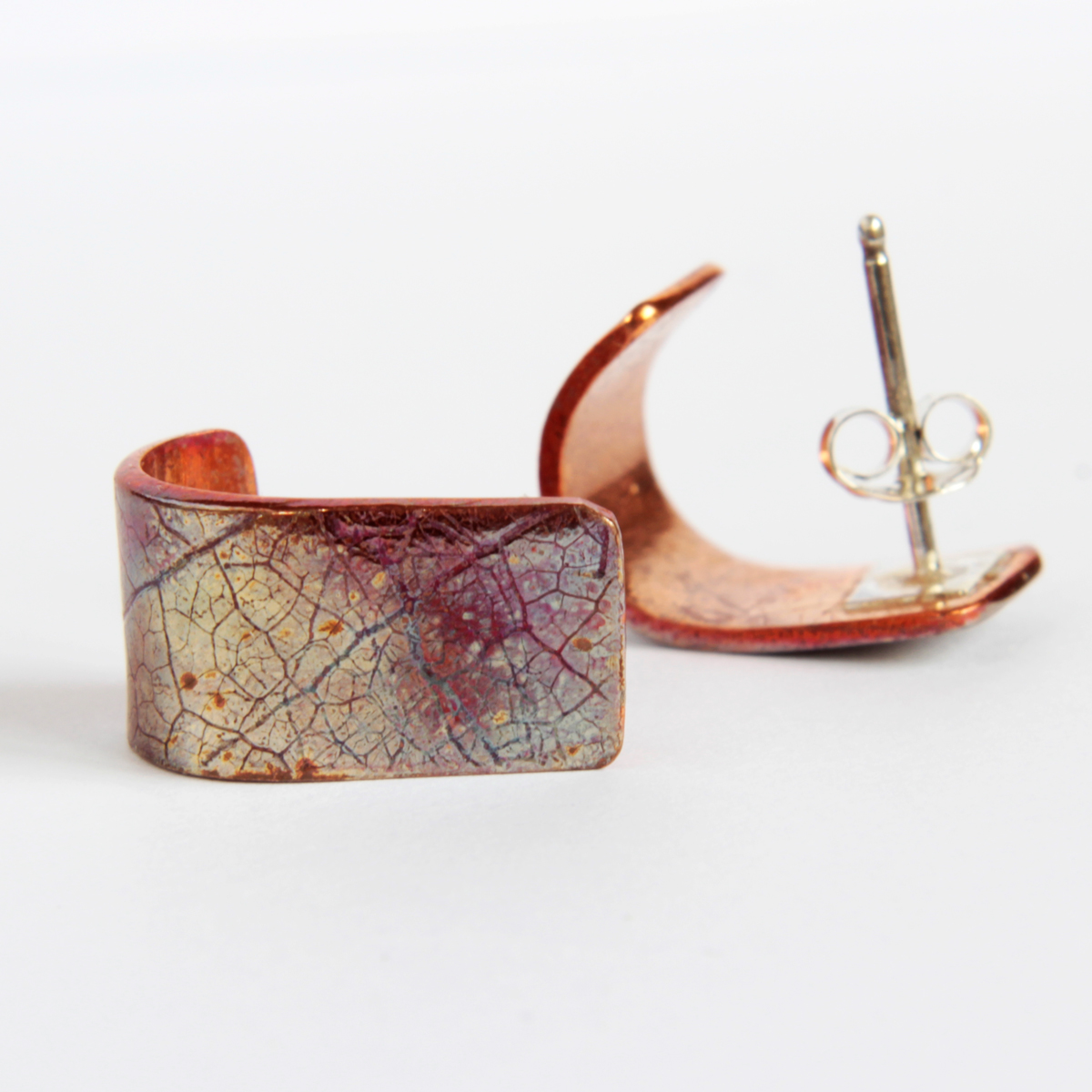 Vörösréz bedugós fülbevaló, nyomott levélmintával, ezüst szerelékkel. Egyszerre modern és a természetet közel varázsoló, irizáló fényekben ragyogó fülbevaló.