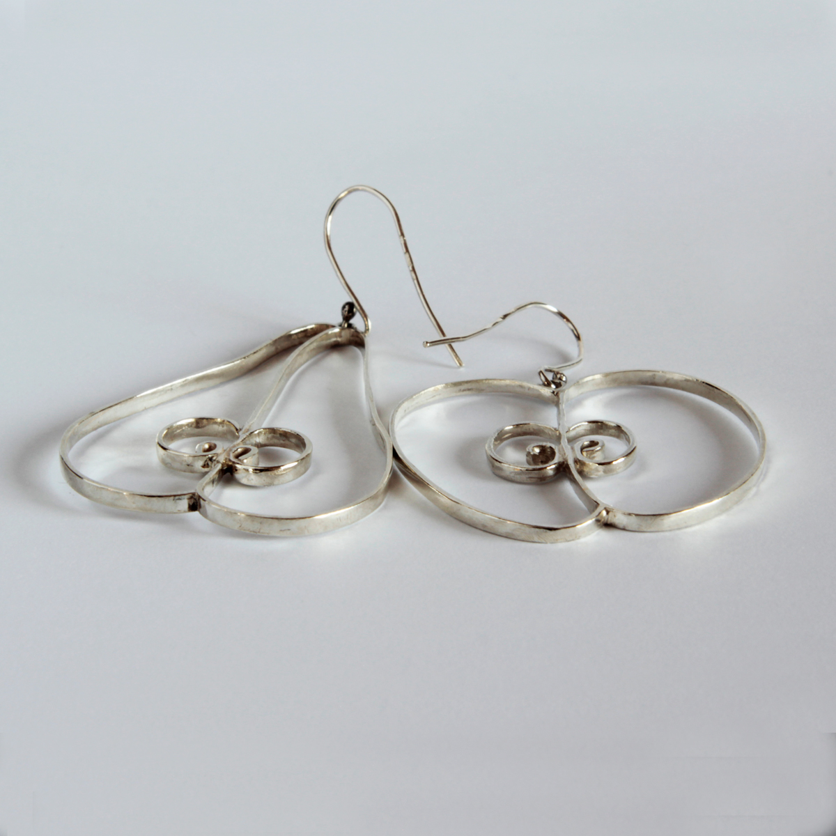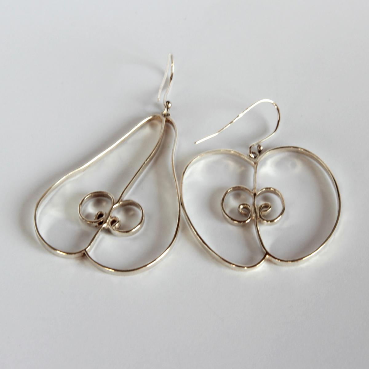 Egy szép nagy fülbe akasztható alma és egy jó nagy körte ezüstből.Anyaga: ezüst. Az alma mérete: 230x30 mm, a körte mérete: 30x43 mm.