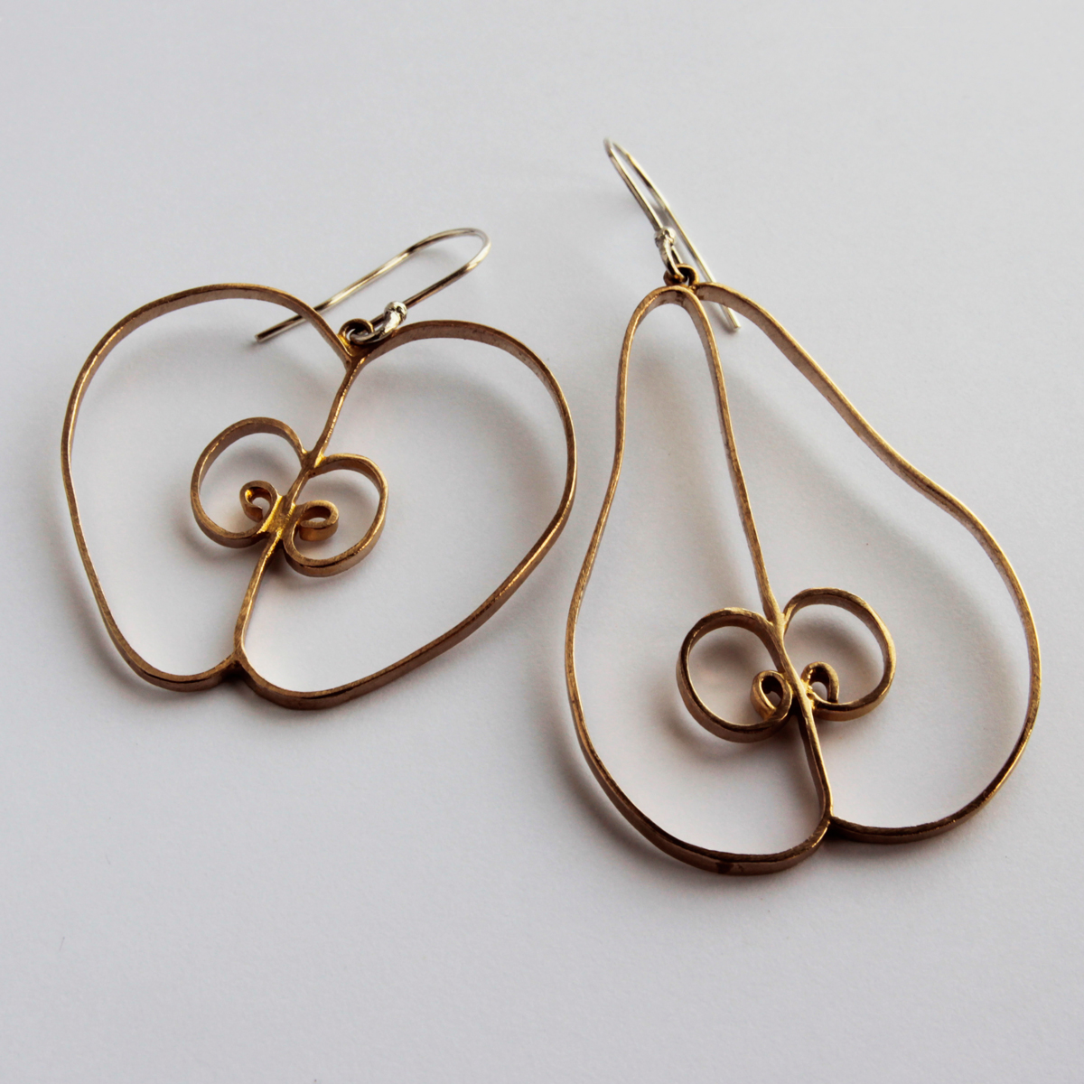 Egy szép nagy fülbe akasztható alma és egy jó nagy körte sárgaréz és ezüst felhasználásával.
