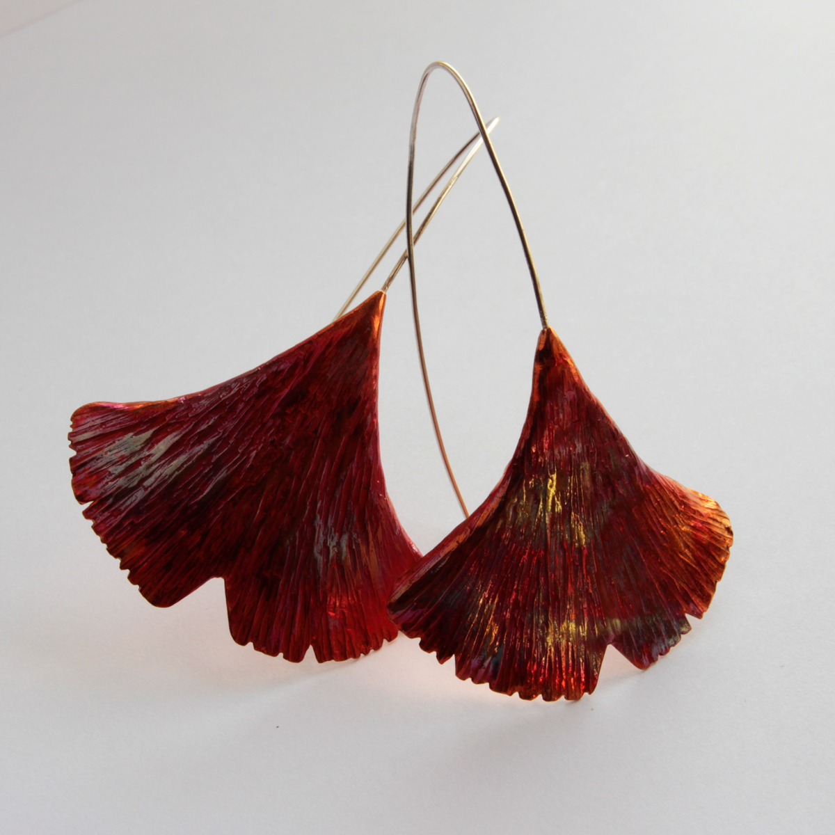 Gyönyörű ginkgolevél formájú fülbevaló. Teljes egészében kézzel készült vörösréz és ezüst felhasználásával. Anyaga: a levél vörösréz, a fülbevaló szára ezüst. Mérete: 65 mm a teljes hossz, a levél szélessége 47 mm.