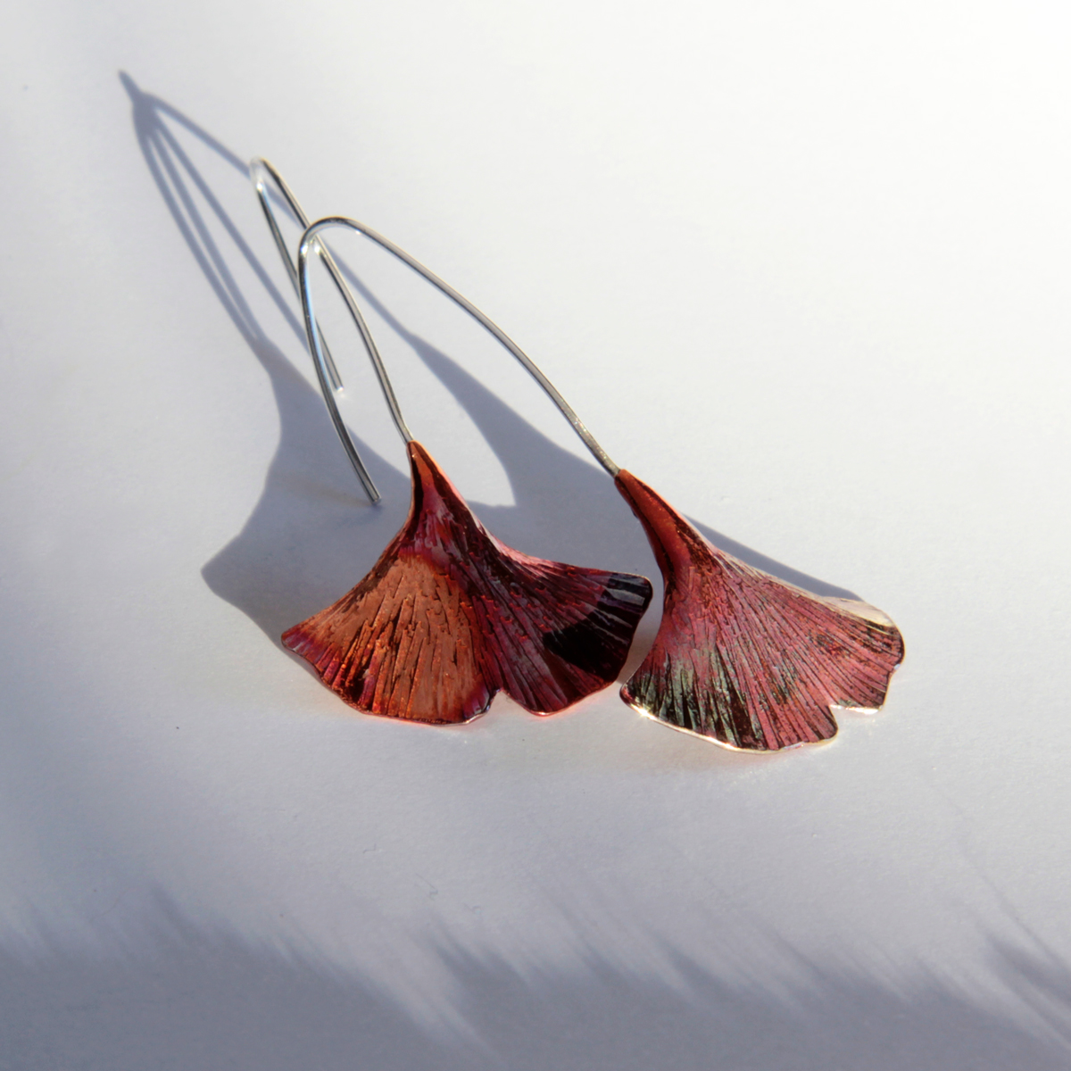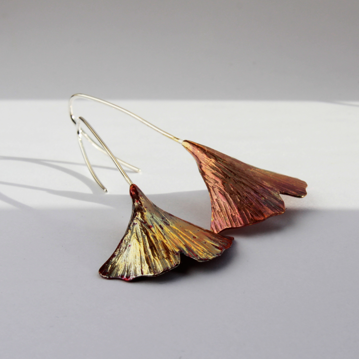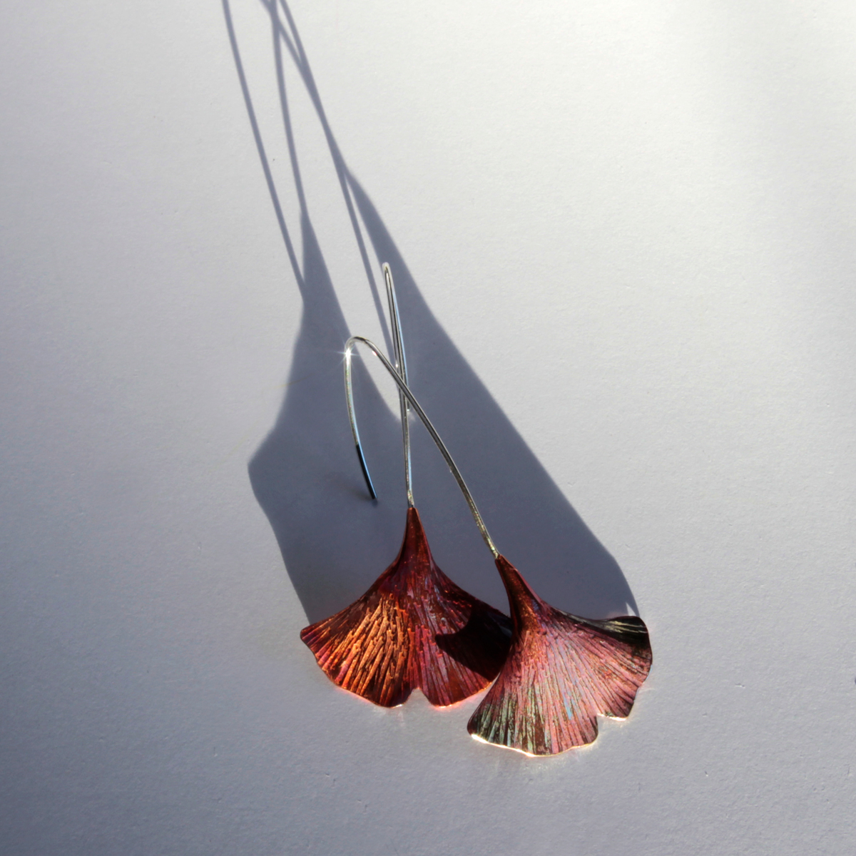 A ginkgolevél a hosszú élet szimbóluma. Teljes egészében kézzel készült fülbevaló vörösréz és ezüst felhasználásával. Anyaga: a levél vörösréz, a fülbevaló szára ezüst. A webshopban található sárgaréz levéllel készült és teljes egészében ezüst verzió is. Mérete: 45 mm a teljes hossz, a levél szélessége 20-25 mm.