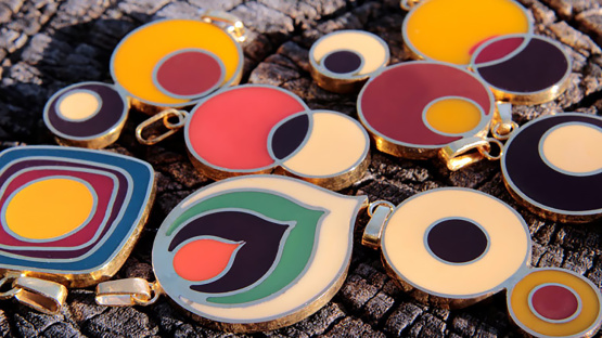 Ha a hetvenes évek lakásainak a tapétái jutnak eszedbe róluk, hát az nem a véletlen műve. Kerek formák és meleg színek kavalkádja - ékszerek formájában.
